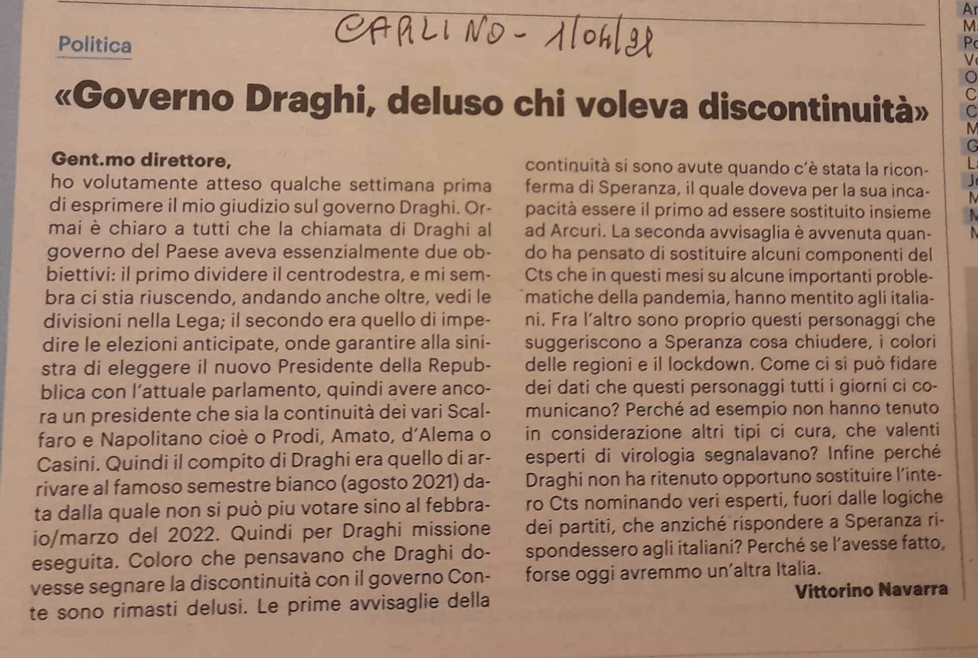 Amici, venti primaverili romani ci dicono di un Draghi intenzionato a dimettersi perché' stanco dei giochetti dei partiti che compongono la maggioranza. Se ciò fosse vero sarebbe la conferma di quanto da me anticipato sulla stampa il 1° aprile 2021.
